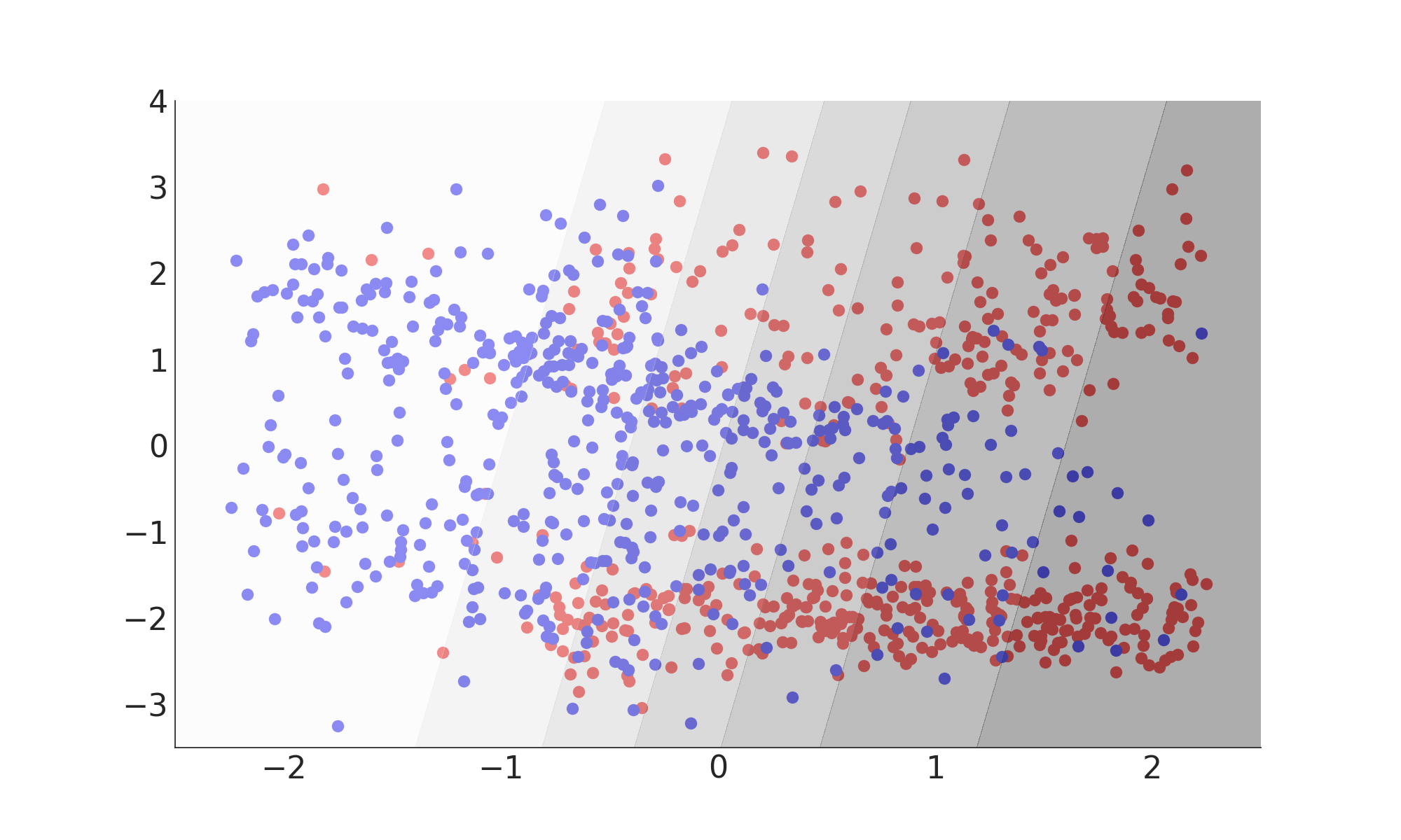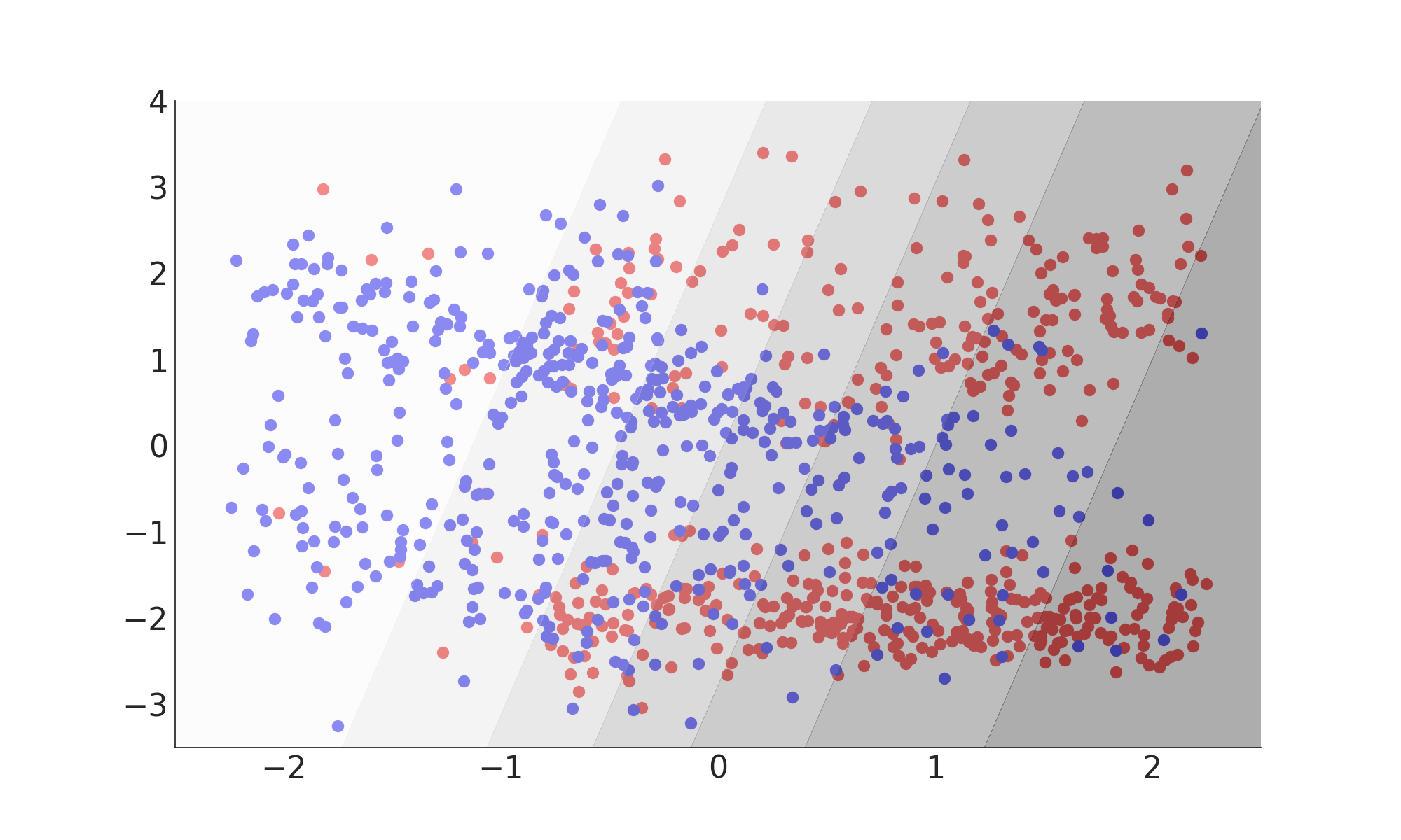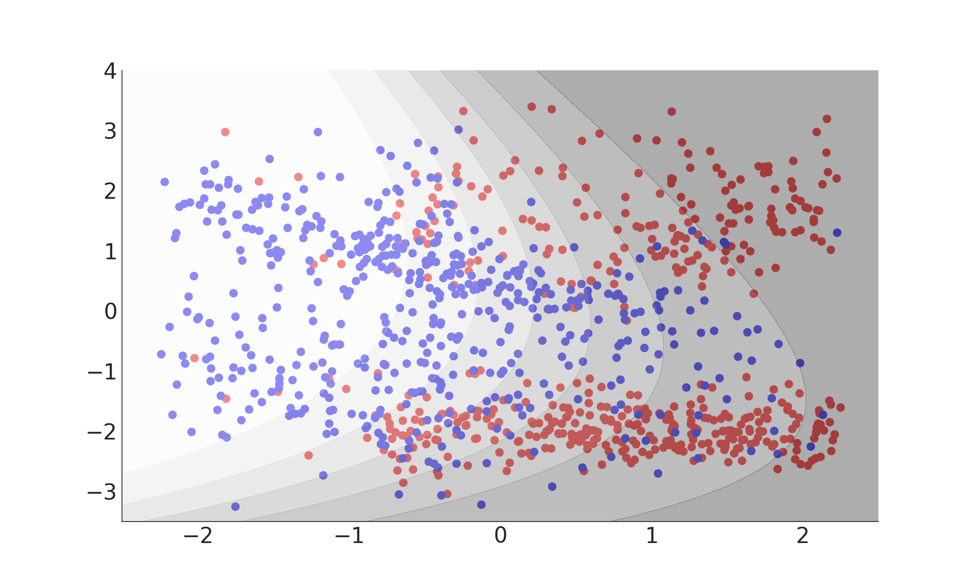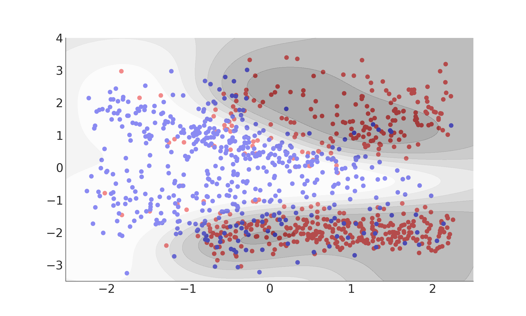 $ f(x) = \frac{\sqrt{2 \pi | \Sigma_{\mathrm{B}} |} \exp\left( - \frac{1}{2} \left(x - \mu_{\mathrm{S}}\right)^{\mathrm{T}} \Sigma^{-1}_{\mathrm{S}} \left(x - \mu_{\mathrm{S}}\right) \right) }{ \sqrt{2 \pi | \Sigma_{\mathrm{S}} |} \exp\left( - \frac{1}{2} \left(x - \mu_{\mathrm{B}}\right)^{\mathrm{T}} \Sigma^{-1}_{\mathrm{B}} \left(x - \mu_{\mathrm{B}}\right) \right) }$
